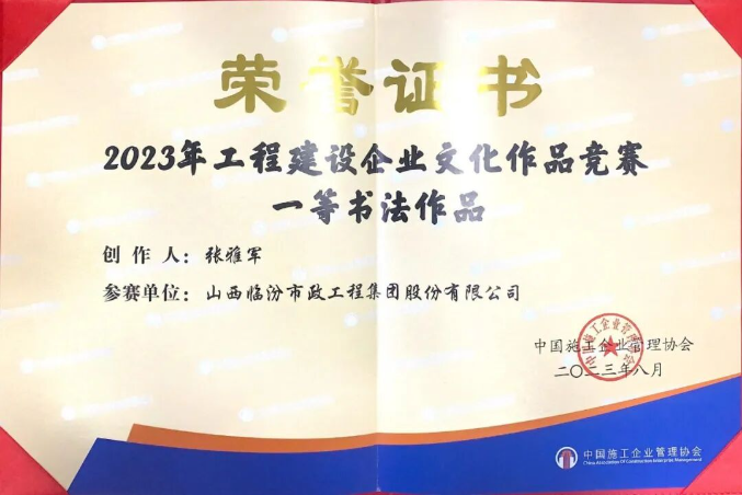 近日,由中國施工企業(yè)管理協(xié)會主辦的2023年工程建設(shè)行業(yè)文化大會在湖北武漢順利召開。會上,中國施工企業(yè)管理協(xié)會發(fā)布了工程建設(shè)企業(yè)文化作品競賽結(jié)果,臨汾市政集團榮獲報紙競賽優(yōu)秀成果、書法競賽一等成果的榮譽。