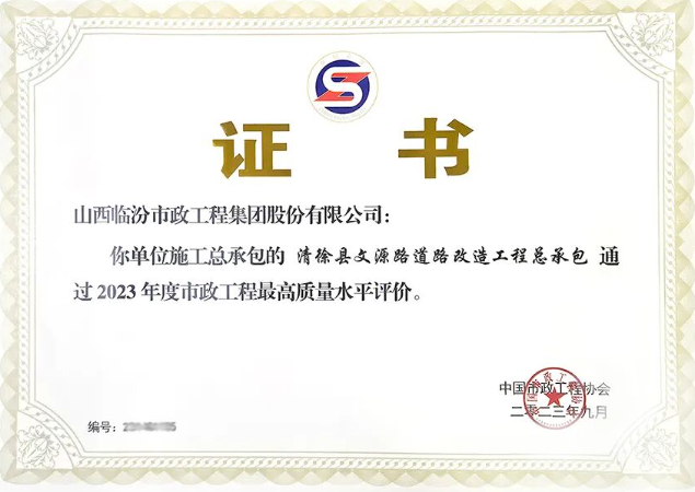 會議介紹了2023年市政工程更高質量水平評價的評選情況,并對獲獎企業(yè)代表頒發(fā)證書,集團承建的清徐縣文源道路改造工程獲此殊榮。該獎項代表市政工程行業(yè)同時期國內先進水平,是我國市政工程行業(yè)在工程質量方面的更高質量水準評價。